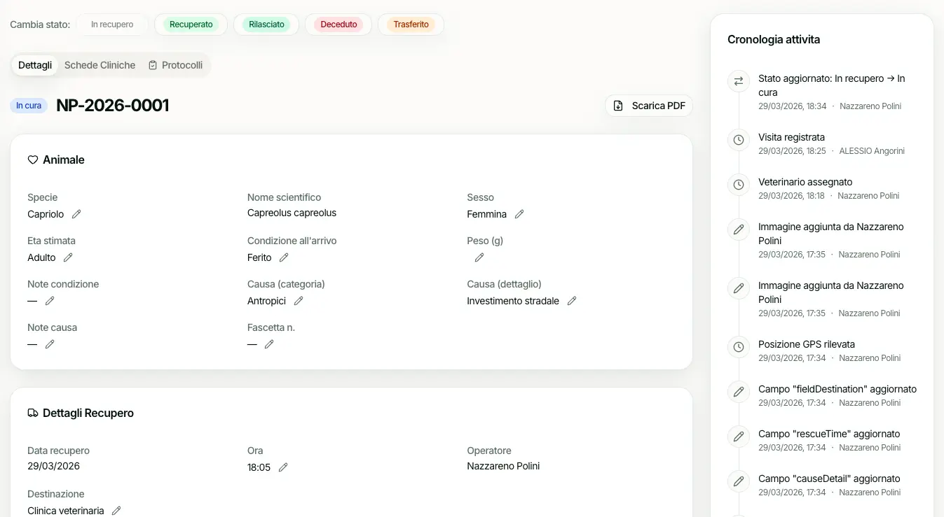 Registro verbali digitale, catalogo specie, cartelle cliniche veterinarie con firma digitale. Tutto il ciclo di vita dell'animale in un unico posto.